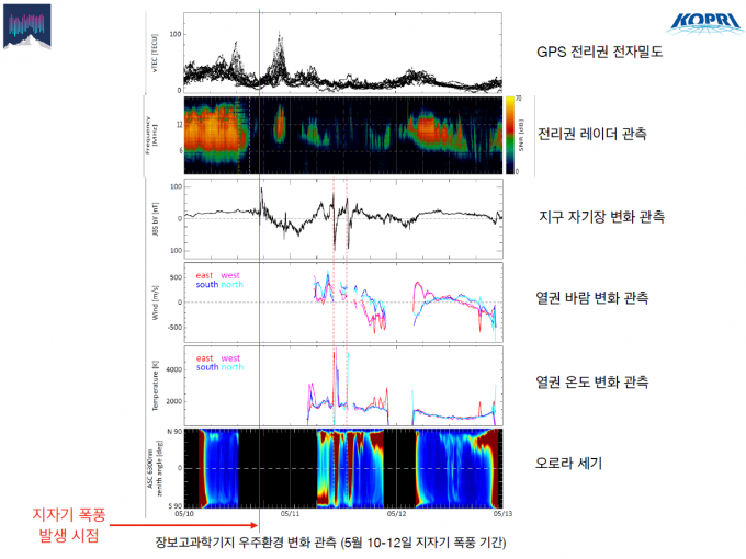 5월 태양폭풍 당시 남극에서도 평소와는 다른 패턴의 오로라가 관측됐다. 장보고과학기지에서 관측된 오로라는 빨간색과 초록색이 주로 보이는 평소와 달리 파란색과 보라색, 노란색 등 다양한 색이 나타났고 더 낮은 고도까지 내려왔다는 점이 특징이다.