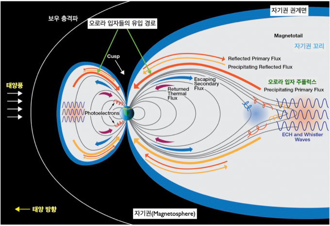 지구는 하나의 커다란 막대자석과 같다. 자기장이 뿜어져 나오는 모습을 나타낸 가상의 선인 자기력선은 지구 극지방에서 나와 지구를 감싸면서 반대편 극으로 들어가는 형태다. 강력한 태양폭풍으로 태양 에너지가 지구 자기권에 전달되면 자기력선에 둘러싸인 지구 중·저위도는 보통 영향을 받지 않는다. 자기력선을 따라 극지방으로 전달된 태양에너지가 극지 고층대기와 부딪치면서 산소나 질소 같은 원소가 이온화되며 다양한 색을 내는 현상이 바로 오로라다.
